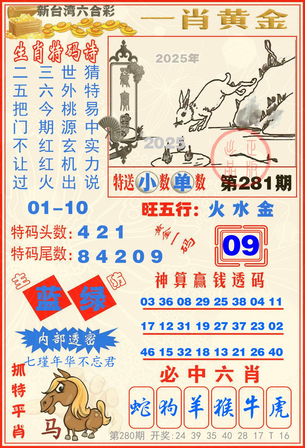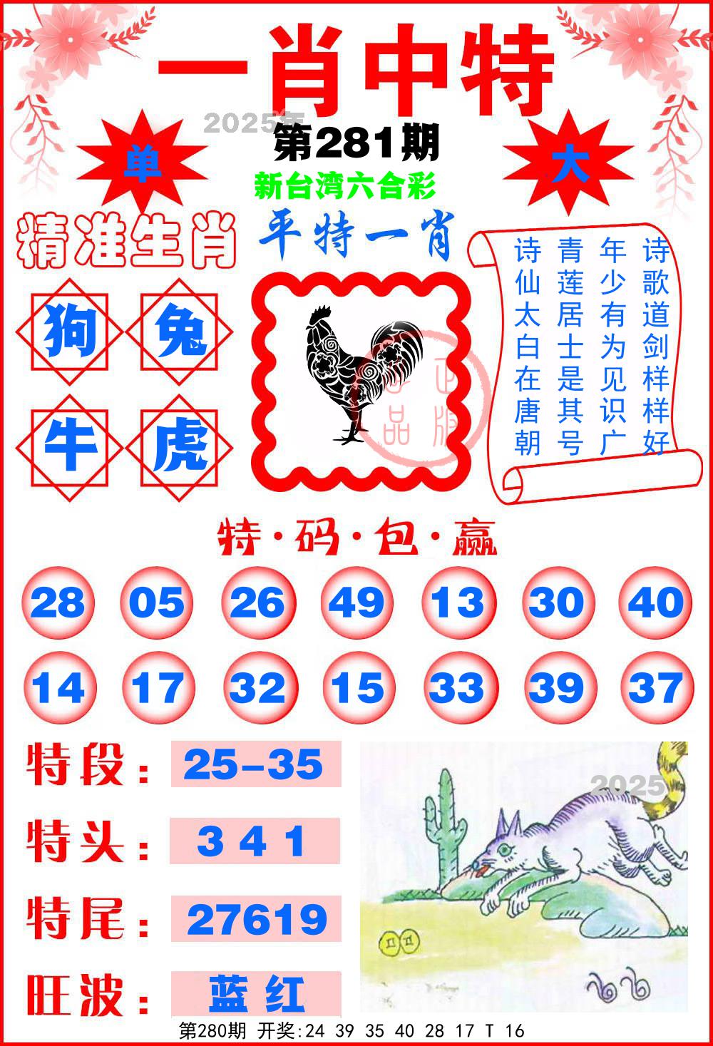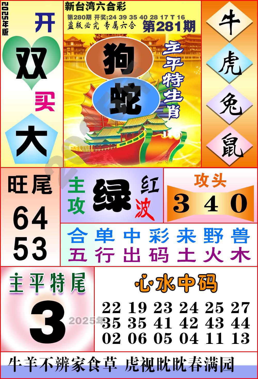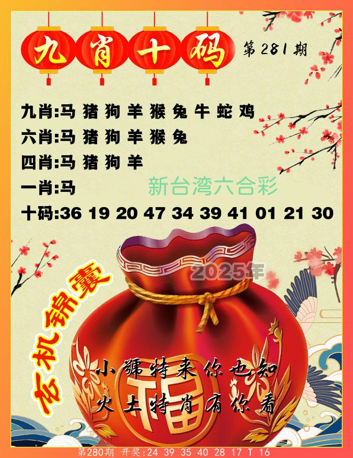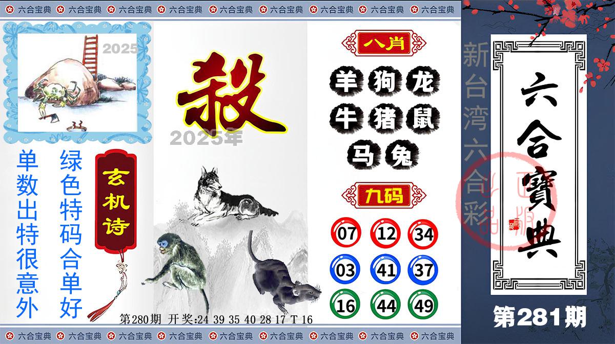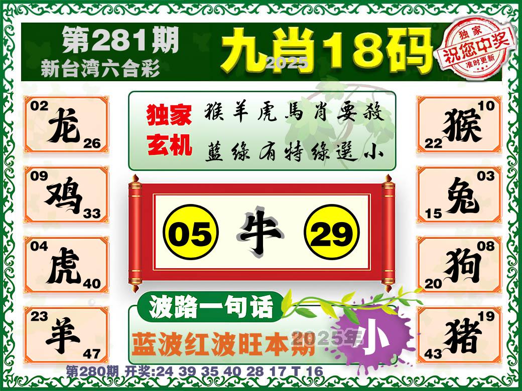 2025281期:九肖 | 羊鸡兔蛇狗牛虎猪龙 | 开:???? |