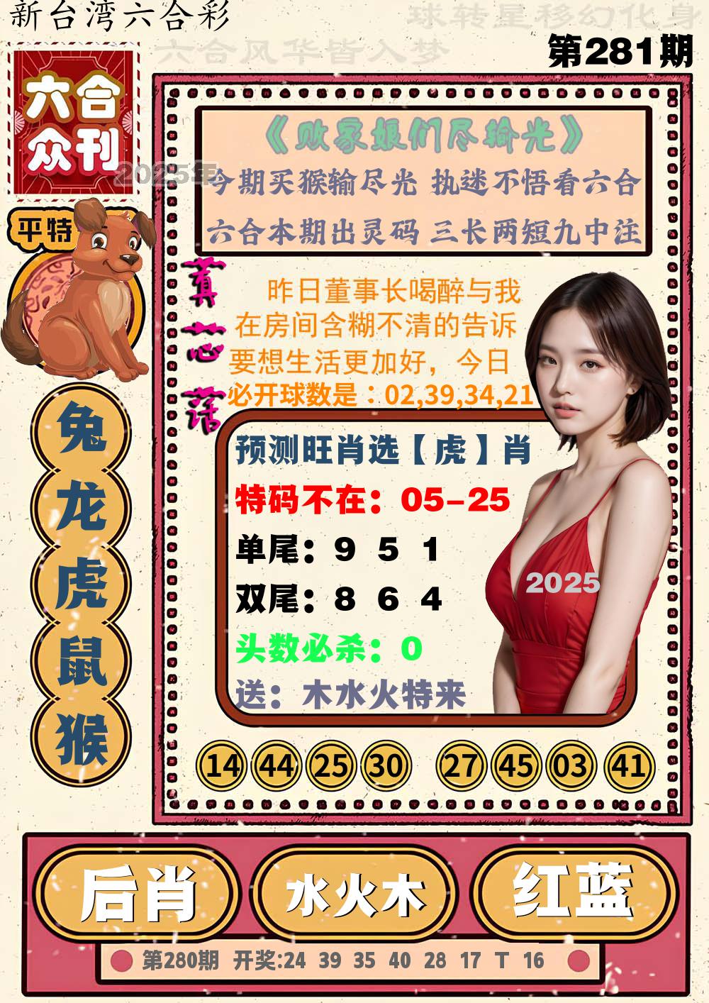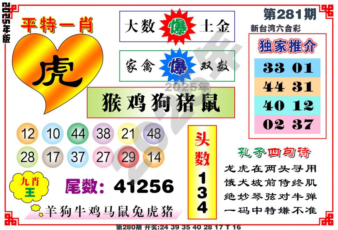 280期:平特一肖〖虎虎虎〗开:16虎对 | |